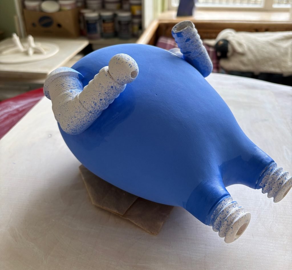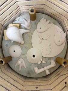 The pieces combine different pottery skills: hand building, mold casting and pinch. Though I have made living creatures, the images are not ones we recognize from our memory. I always leave some clues on the pieces for the viewer to question in their imaginations, creating an immediate interesting moment when the audience first encounters the pieces.