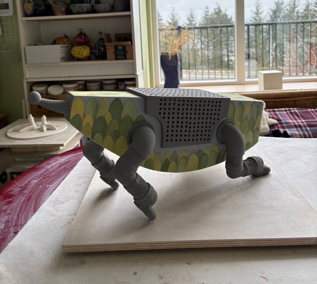 AI technology can be seen everywhere in our daily life. The common existence of moving gears directed me into this new body of work. I made the creatures, transformed and with industrial parts. Some of them have mixed media attached to copy the high-tech model. I used under-glaze to hand paint on the AI creatures or I made strange weapons held in the creatures’ hands. This is the way I make the identity different for each piece. The hand painted patterns on the surface are symbols that carry different meanings. For example, the grasshopper with a pattern of green stripes imitates the grass from where they originally come.