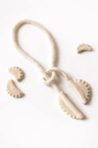 The works in this exhibition are made from air-dry clay, a material commonly associated with children’s crafts and informal learning. Its accessibility and familiarity reflect ideas of generational knowledge, domestic labor, and care work, aligning with the experience of navigating art-making alongside early motherhood. Each piece is formed entirely by hand using techniques borrowed directly from dumpling-making: kneading, crimping, wrapping, and pinching. While some works closely resemble dim sum or dumplings, others abstract these gestures, distilling the essence of what a dumpling represents—small, contained forms shaped through repetition, patience, and care.