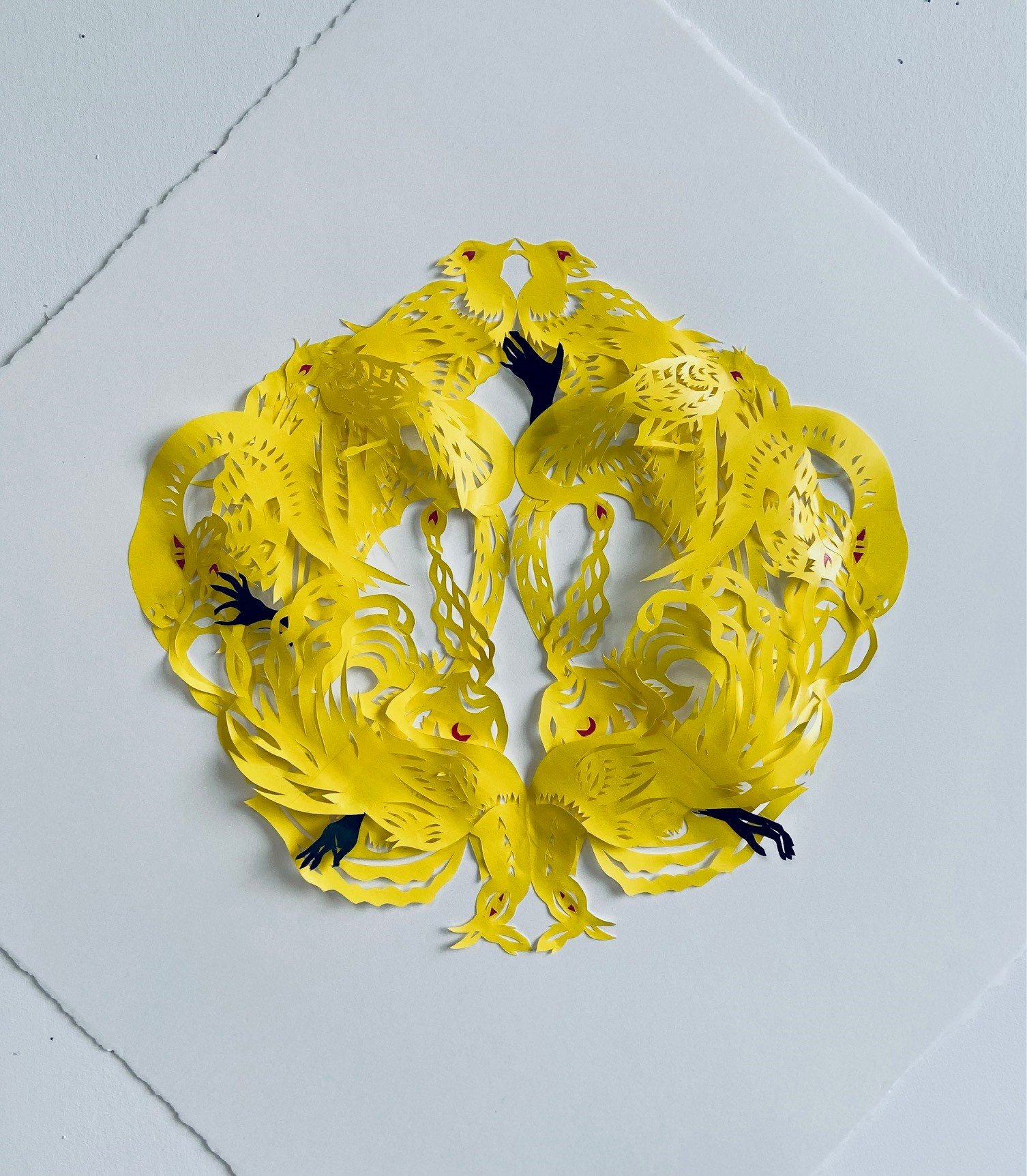 Recognized for his intricate cut paper works, Robles combines the delicacy associated with traditional hand work that addresses psychological and emotional states ranging from animist familiars, folklore, spirits, trauma, and grief.