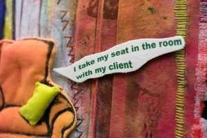 Bits and Pieces of ideas that my witness expressed in our two conversations made it into the overall concept for the artwork. Her chair and the idea that she ‘takes her seat in the room with her client’ meaning being there fully for them was the source and inspiration for I Take My Seat.