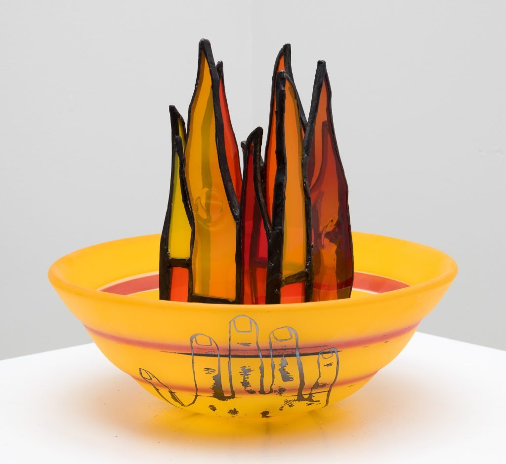 The work centres around the silhouetted figure of the Witness in profile, with her head tilted upwards, her mouth open with teeth bared in a grimace, and her fists raised in the air in a gesture of anger and frustration. Her figure is surrounded by metallic flames depicting her rage. Above this tableau is a swirl of blue paper cut with tear drop shapes depicting her sorrow. There is a red love heart cracked into two pieces, positioned on her upper arm, depicting heartbreak.